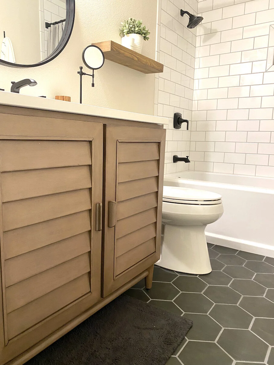 The next step was the floor tile. Hex tile is my new flooring obsession, and I couldn’t wait to incorporate it into this space. I knew it would be the perfect ‘manly touch’ but also be simple enough to not take over the tiny space. I waffled a bit with grout color, but finally settled on dark gray for a slight contrast. I LOVE how it turned out. Now I just hope my son can keep it clean!